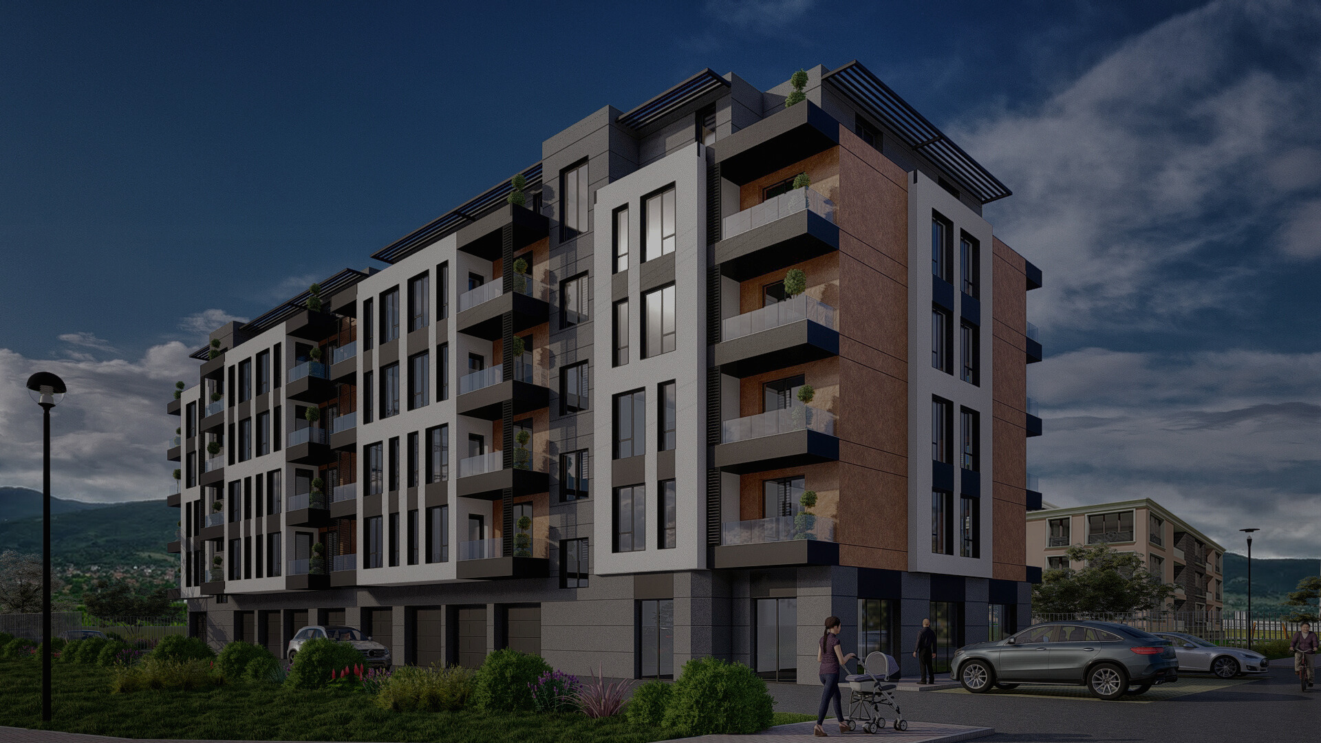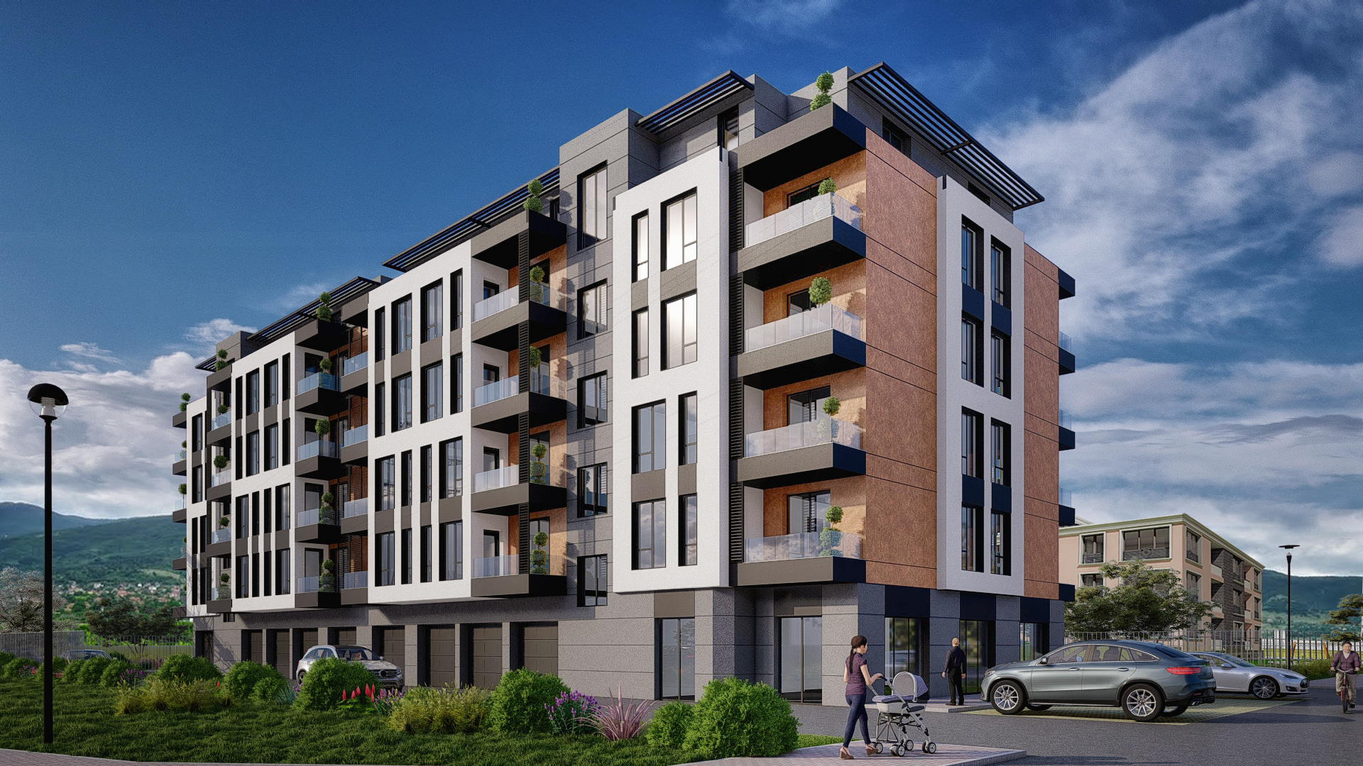 Проектът включва обширни зелени пространства, алеи и места за отдих, които създават балансирана и здравословна атмосфера, подходяща за релакс и семейно прекарване.